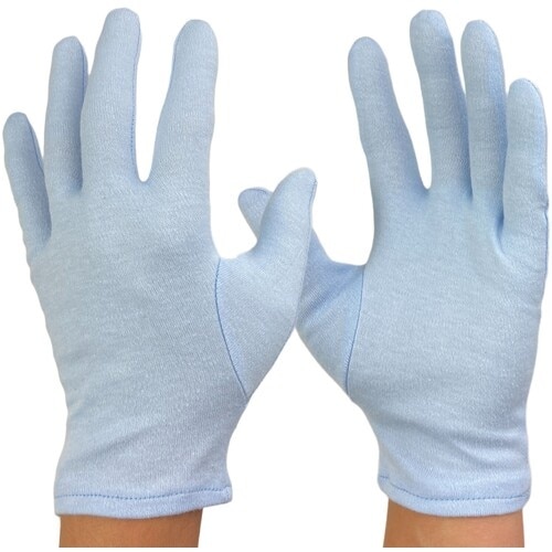 編み目のしっかり詰まったライトブルーの綿手袋です。安価で吸汗性に優れインナー手袋から作業用途、手荒れ予防まで様々な用途にご使用出来ます。