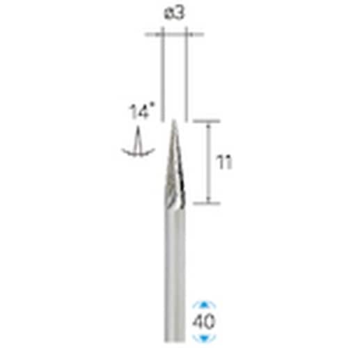 形状:テーパー | 刃径(mm):3 | 刃長(mm):11 | 軸径(mm):3 | 全長(mm):40 | 最高使用回転数(rpm):45000 …