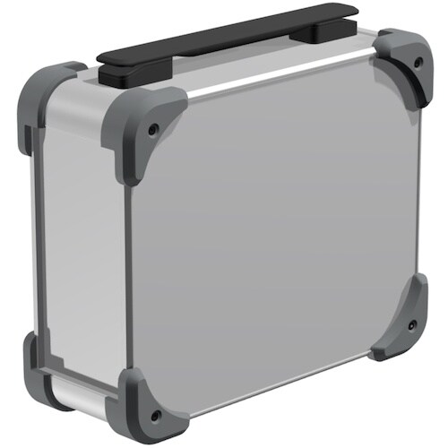 キャリングハンドル付の耐衝撃型アルミケースです。コーナーガードは弾力性のあるTPE (エラストマ) 製で、 滑りにくくゴム足の役割にもなります。