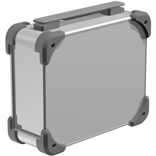 キャリングハンドル付の耐衝撃型アルミケースです。コーナーガードは弾力性のあるTPE (エラストマ) 製で、 滑りにくくゴム足の役割にもなります。