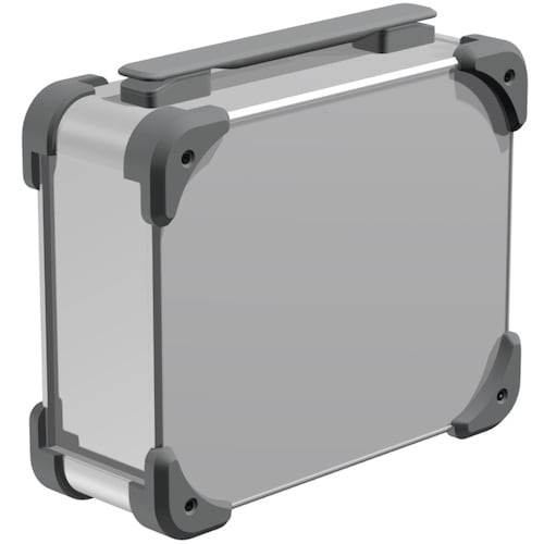 キャリングハンドル付の耐衝撃型アルミケースです。コーナーガードは弾力性のあるTPE (エラストマ) 製で、 滑りにくくゴム足の役割にもなります。