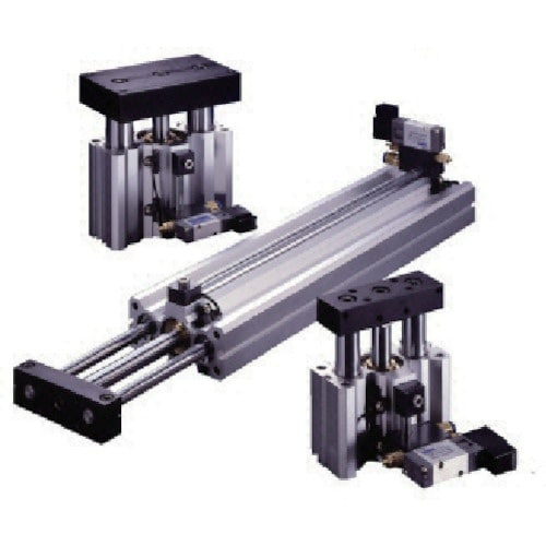 ガイド経の太いストッパータイプのツインガイドシリンダ。滑り軸受けタイプです。ワークのストッパー専用のシリンダーです。 |