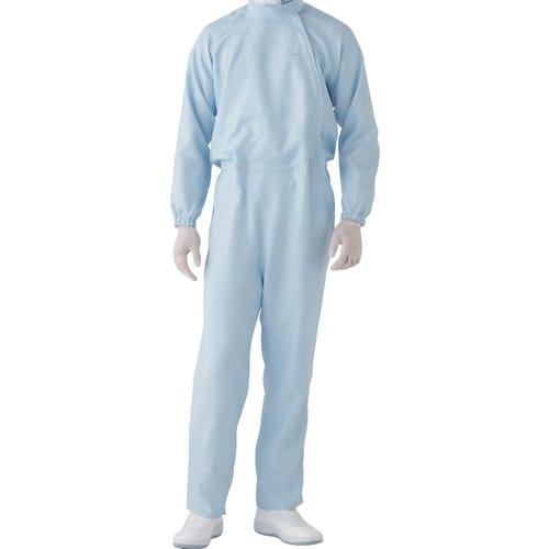 超静電性素材に従来の3倍の通気性と柔軟性を加えました。斜めファスナー採用で、製品不良の原因となる前面からの塵埃漏洩を防ぎます。作業者からの発塵とESD防止対策。 |
