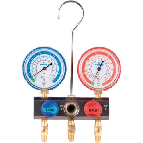 流通口径が大きいので真空引時間、冷媒充填時間が短縮されます。脈動振動吸収式ゲージなので針の振れが少なく読みとりやすいゲージです。冷凍空調設備の冷媒ガスの充填回収に。