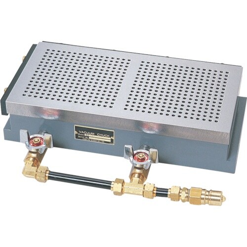 チャック作業面のワーク設置以外の吸入孔は、マスキングテープで塞ぐシンプル構造です。大気圧を応用した圧着保持装置です。非鉄金属をはじめ非磁性材のワークを圧着し、工作機械による加工作業に応用できます。 |