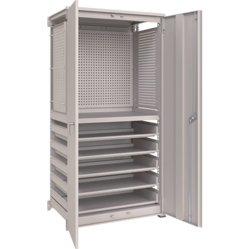ユニット保管庫にパンチングパネルを取り付けました。工具などの保管に便利です。ロック機構付で別売の小引出しが搭載可能なスライド棚付の保管庫です。 |