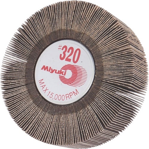 粒度(#):320 | 最高使用回転数(rpm):15000 | 外径X幅X軸径(mm):80X25X6 | その他仕様:軸付フラップホイールの斜め植…