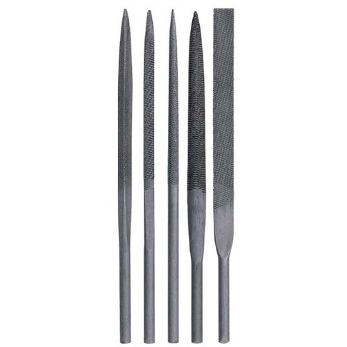 荒目のヤスリ、平・半丸・丸・角・三角の5種類(各1本ずつ)をセットにしました。一般ヤスリ、鉄系研削用。 |