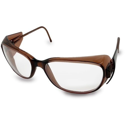 茶色フレームの側板付きモデルです。テンプル(耳掛け部)の曲げ伸ばし調節が可能です。飛来物、浮遊粉じん、液体飛まつなどから目を保護します。熱硬化性樹脂CR−39を基材したレンズです。 |