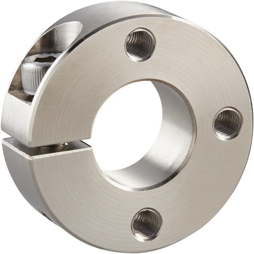 締結力の強いスタンダードスリットカラーです。面で締め付けるため締結力が強く、シャフトに傷が付きにくいタイプです。3ネジ穴付のためブラケットの取り付けや、セットカラーの固定ができます。 |