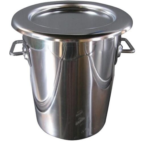 テーパー形状のため、空の状態で積み重ねて保管ができます。付属の蓋を使用し、積み重ねもできます。本体は継ぎ目のない一体絞りで、本体と取手は隙間のない全周溶接です。食品の保管・運搬に。 |