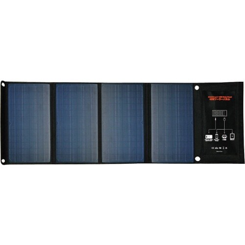 大型の40Wソーラーパネルを使用しているので、小型のパネルに比べて早い充電が可能。5VのUSB出力も装備しているので幅広いUSB機器への充電が可能。4つに折りたためるのでコンパクトに持ち運べる。 |