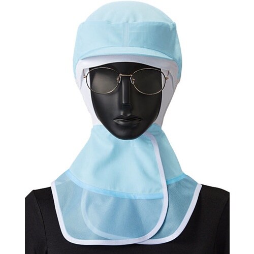 色:アイスブルー | サイズ:S | 頭周り(cm):54ー58 | つば:あり | タイプ:ヘアネット一体型ロングフード | その他仕様:ヘアネット…