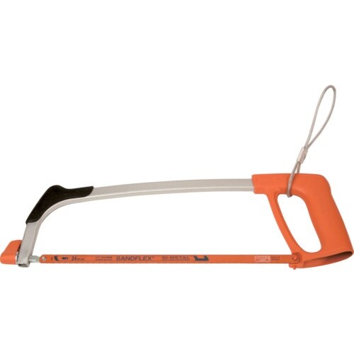 ランヤード用のループが付いた、高所作業向けハンドソーフレームです。サンドフレックスバイメタルハンドソー24山付です。 |