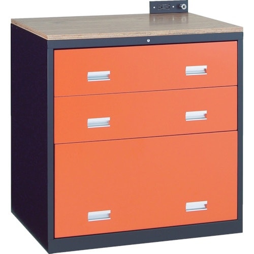 木製天板の上で作業ができます。オールロック機構(全ての引き出しが同時にロックされます。)ラッチ機構を内蔵し移動時や地震などによる引き出しの飛び出しを防ぎます。またキャビネットを転倒事故から守ります。 |