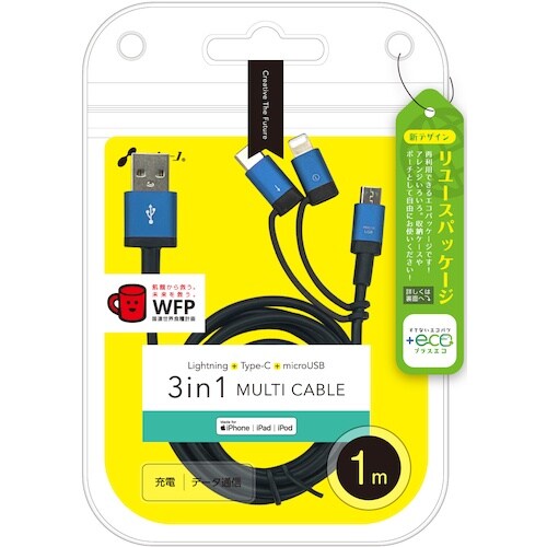タイプC、マイクロUSB、ライトニングMFI、3種類の充電がこれ1本で可能です。 |