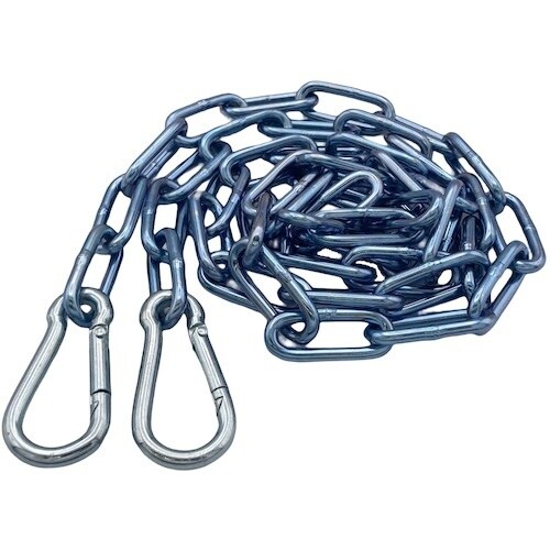 溶接チェーンは切断済み、両側にフックを取り付けています。スチール製ですが、ユニクロ鍍金を施しており防錆性・耐候性に優れています。転倒防止、進入禁止、境界用の仕切りに。