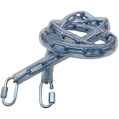 溶接チェーンは切断済み、両側にフックと保護チューブを取り付けています。スチール製ですが、ユニクロ鍍金を施しており防錆性・耐候性に優れています。転倒防止、進入禁止、境界用の仕切りに。 |