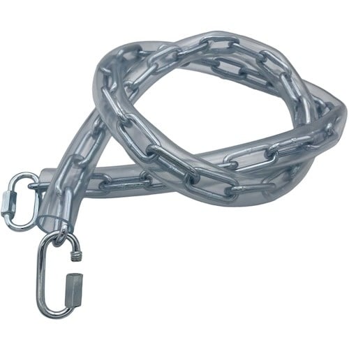 溶接チェーンは切断済み、両側にフックと保護チューブを取り付けています。スチール製ですが、ユニクロ鍍金を施しており防錆性・耐候性に優れています。転倒防止、進入禁止、境界用の仕切りに。 |