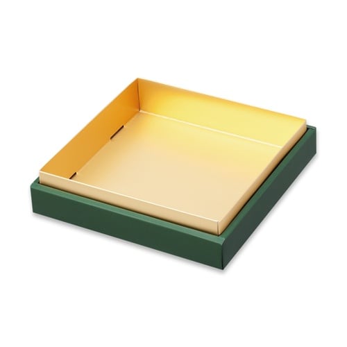 和洋どちらでも使えるオールマイティーなギフトシリーズです。深いグリーンでマットな質感、ゴールドの中箱で高級感があります。フタ・ソコ・中箱の3点セットです。中箱に仕切は付いていません。 |