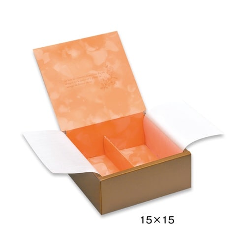上品な光沢感のブロンズカラーのブック式ギフトケースです。華やかなオレンジ色ベースの内装がお菓子の焼き色を引き立てます。本体・仕切・巻紙の3点セット。 |