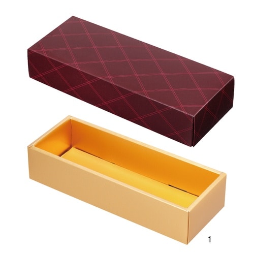 ツヤのあるブラウンとゴールドの組み合わせが高級感を演出します。ブランデーケーキのほか、カットパウンドにも最適。題字なしタイプ。フタ・ソコ・パットの3点セット。 |