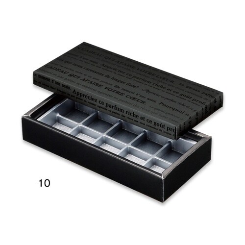 トリュフ用のギフトケースです。10仕切りタイプ。表面ニス加工。フタ・ソコ・グラシンパット1枚・チョコグラシン1枚・銀トレーの5点セット。トレー1角のサイズ:30mm角×高20mm |