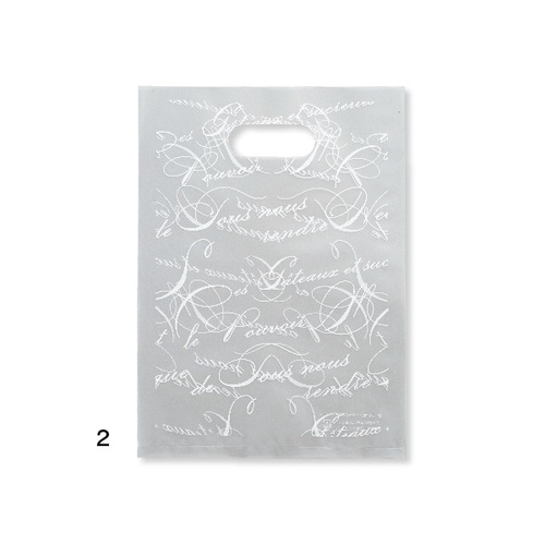 仏語デザイン入りのお持ち帰り用ポリ袋です。手抜きタイプ。素材の厚みが50μmのため、お客様への無償配布が可能です。側面左下に有料化対象外必要表記あり。 |