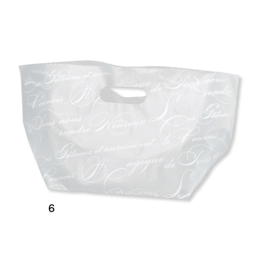 仏語デザイン入りのお持ち帰り用ポリ袋です。手抜きタイプ。素材の厚みが50μmのため、お客様への無償配布が可能です。底マチ部分に有料化対象外必要表記あり。