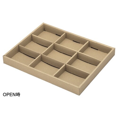 平置きタイプのクッキーケースです。1角に重ねて2枚入れられます。8仕切りタイプ。仕切の下にクッション性・ゆがみ防止の厚めのパットが入ります。フタ・ソコ・仕切A・仕切B×2・パットの6点セット。 |
