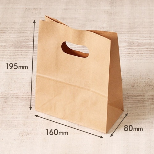 手穴のあいた、クラフトカラーの手提げ袋です。手穴の裏面にはフィルム貼りの補強加工が施してあり、持ち運びも安心です。お菓子などのお持ち帰り用にピッタリ。。 |