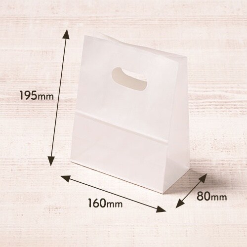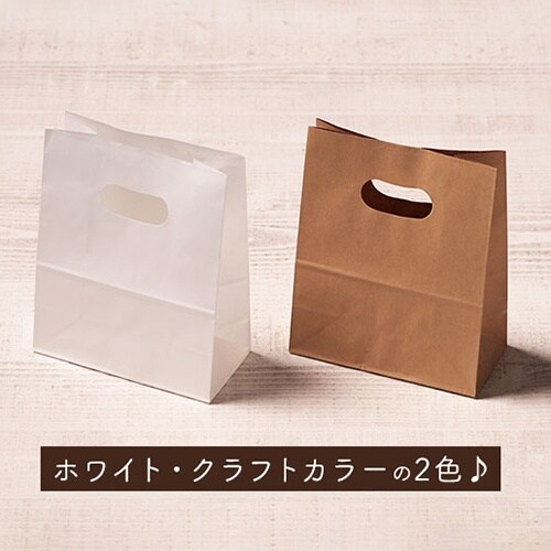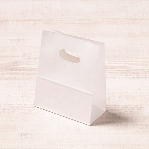手穴のあいた、ホワイトカラーの手提げ袋です。手穴の裏面にはフィルム貼りの補強加工が施してあり、持ち運びも安心です。お菓子などのお持ち帰り用にピッタリ。 |