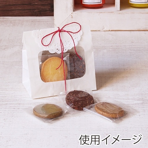 窓つきの耐油袋で、中身が見えるので焼き菓子などのプチギフトの詰め合わせにぴったりです。クッキーなら3から5枚を目安として入れられます。 |