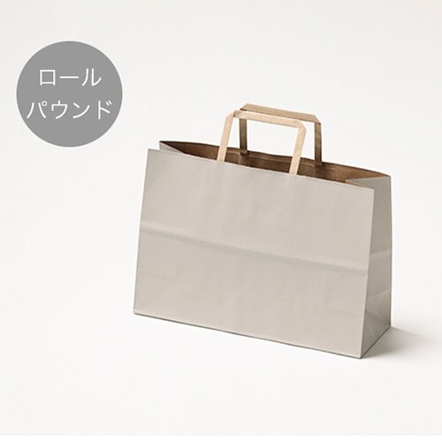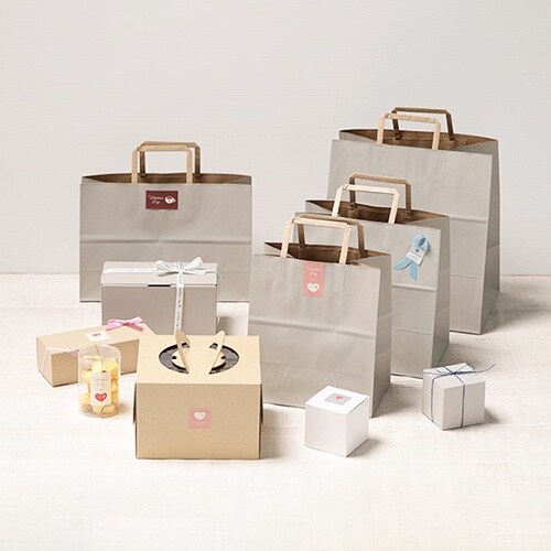 グレーカラーの手提げ付き紙袋。表面はグレー印刷にマット加工が施してあり手紐や内側はクラフトカラー。パウンドケーキ箱やロールケーキ箱、ガトーボックスが入るサイズでお持ち帰りやギフト用にオススメ。