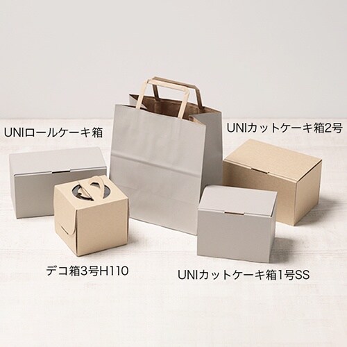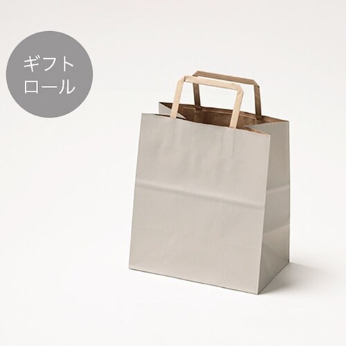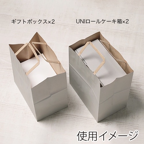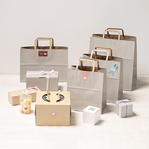 グレーカラーの手提げ付き紙袋。表面はグレー印刷にマット加工が施してあり手紐や内側はクラフトカラー。カットケーキ・ロールケーキ箱が入るサイズでお持ち帰りやギフト用にオススメです。