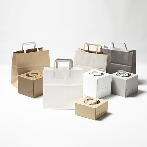 ホワイトカラーの袋にグレーの手提げが付いたバイカラーがおしゃれな紙袋。マチ広で、ホールケーキ箱4号やギフトボックスが入るのでお持ち帰りやギフト用におすすめです。 |