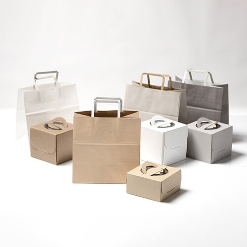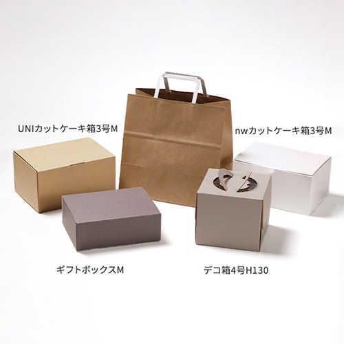クラフトカラーの袋にホワイトの手提げが付いたバイカラーがおしゃれな紙袋。マチ広で、ホールケーキ箱4号やギフトボックスが入るのでお持ち帰りやギフト用におすすめです。