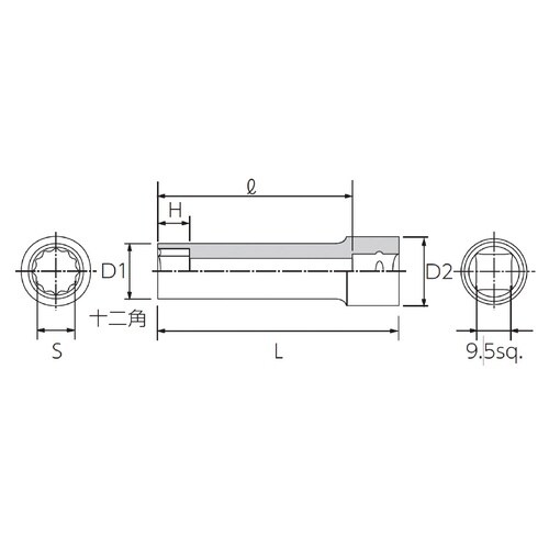 差込角(sq.):9.5 | サイズ(S;inch):7/16 | ソケット部外径(D1;mm):16 | 差し込み部外径(D2;mm):17 | 深…