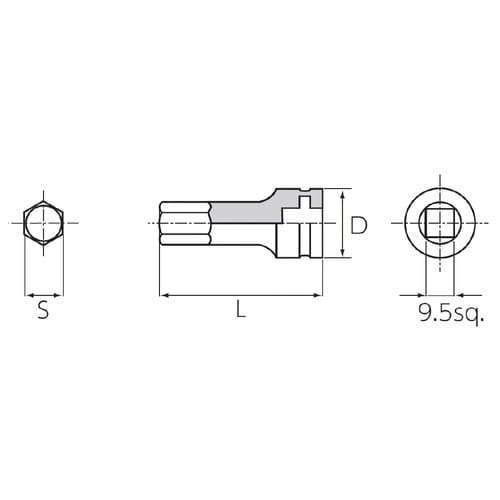 差込角(sq.):9.5 | サイズ(S;mm):5 | ソケット差込部外径(D;mm):22 | 全長(L;mm):45 | 質量(g):53 | …