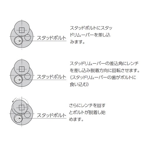 | 注意事項 | ※ボルトに工具がしっかりとホールドされたことを確認してから力を加えて下さい。スタッドボルトのねじ山が破損する場合があります。 |