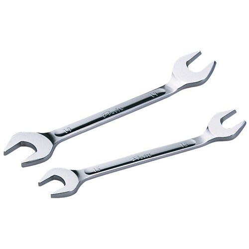 先端部をテーパー形状にし、従来品に比べ厚さを薄く、特に先端部分を薄くしました。口径サイズは1サイズのみで、片側のみ25゜の立ち上がり角度を設定しています。各種機械のダブルナット締緩作業にも便利です。従来のスパナが使いにくい場所、自動車のキャブレター回りやマニホールド取付け部分など、特に狭い場所やボルト・ナットが薄い場合などの作業に有効です。