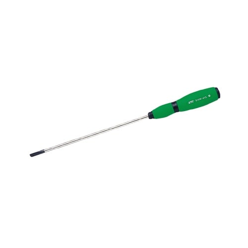 先端マグネット付の細軸タイプのマイナスソフトドライバです。非貫通タイプです。グリップは軽く、ベトつき感がなく、環境にやさしい素材(エラストマ)を採用しています。グリップのグリーン色はマイナスを表しています。軸の材質はCr−Vです。