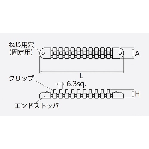差込角(sq.):6.3 | クリップ数:15 | 寸法H(mm):19 | 寸法A(mm):25 | 全長(L;mm):319 | 質量(g):12…