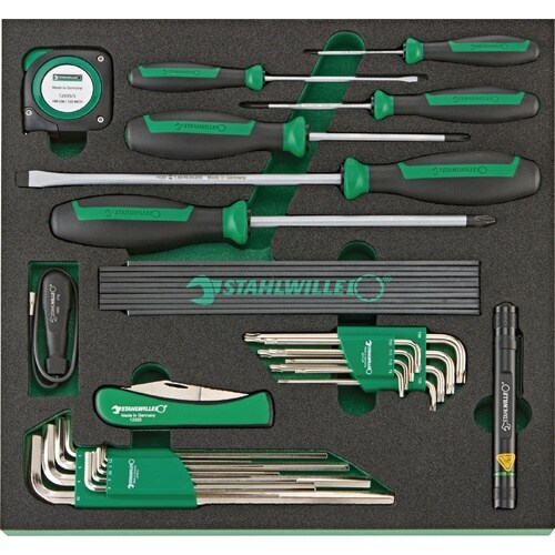 ツールは高精度で立体的に切り取られた耐薬品性安全発泡体インサートに配置されています。 |