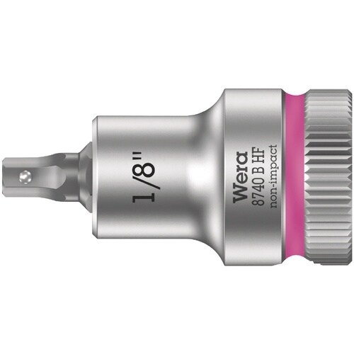 8740 B HFシリーズ。3/8インチのドライブと保持機能を備えたビットソケットは、ワークピースにねじを送り込むときにねじを紛失するリスクを軽減し、特に快適なねじ回しを実現します。サイズごとに色分けされた「Take it easy」ツールファインダーにより、工具を素早く簡単に識別できます。下端のローレット加工により、手動で使用する際のグリップ力が向上します。クロムバナジウム鋼、マットクロムメッキ仕上げ。