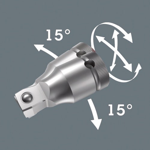 8794 Bシリーズ。Zyklop の「Wobble」エクステンション。首振り角度は全方向15°です。隠れた狭い設置状況でも迅速かつ正確な作業が保証されます。後端にローレット加工を施し、手で操作する際のグリップ力を高めます。弾丸トラップ溝付き。マットクロムメッキのクロムバナジウム製。