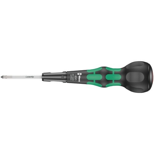 プラスネジ用のKraftformハンドルシリーズ 1800を備えたドライバーです。ハンドルが手にピッタリと収まります。凸型形状により、高いトルクの伝達が可能です。ソフトハンドルゾーンは、良好なグリップ感とロスの少ないパワー伝達が得られます。硬いハンドルゾーンは、手のひらで圧力をかけている時でも、高いパワー伝達を可能にします。ハンドル上端の凹みが、ネジ回し使用時の微調整を容易にします。ハンドルとブレードの境目が狭いため、狭い場所の奥にあるネジにも容易に手が届きます。ハンドル後端には転がり防止機能が付いているので、作業場でツールが転がって迷惑になることがありません。Wera(ヴェラ)レーザーチップドライバーは、レーザー光線により、微視的に粗面化されています。粗面化された表面がネジ頭に「食い込む」ので、予期せず外れることがありません。