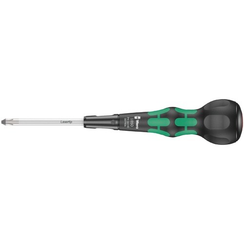 プラスネジ用のKraftformハンドルシリーズ 1800を備えたドライバーです。ハンドルが手にピッタリと収まります。凸型形状により、高いトルクの伝達が可能です。ソフトハンドルゾーンは、良好なグリップ感とロスの少ないパワー伝達が得られます。硬いハンドルゾーンは、手のひらで圧力をかけている時でも、高いパワー伝達を可能にします。ハンドル上端の凹みが、ネジ回し使用時の微調整を容易にします。ハンドルとブレードの境目が狭いため、狭い場所の奥にあるネジにも容易に手が届きます。ハンドル後端には転がり防止機能が付いているので、作業場でツールが転がって迷惑になることがありません。Wera(ヴェラ)レーザーチップドライバーは、レーザー光線により、微視的に粗面化されています。粗面化された表面がネジ頭に「食い込む」ので、予期せず外れることがありません。