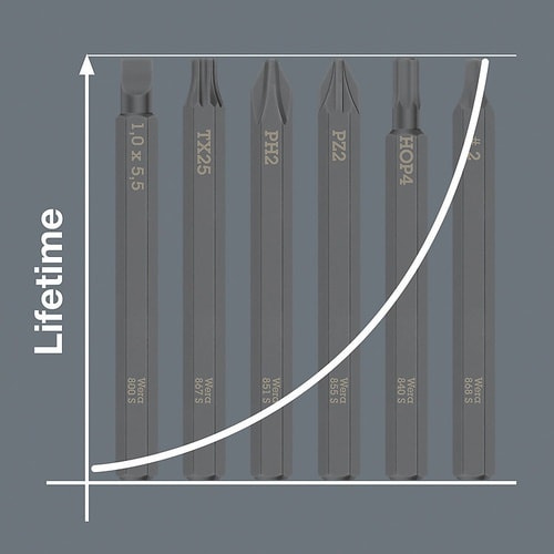 855 Sシリーズ。ポジドライブプラスネジに最適。非常丈夫で長寿命。1/4inch六角ドライブ。Weraインパクトドライバー921と併用。