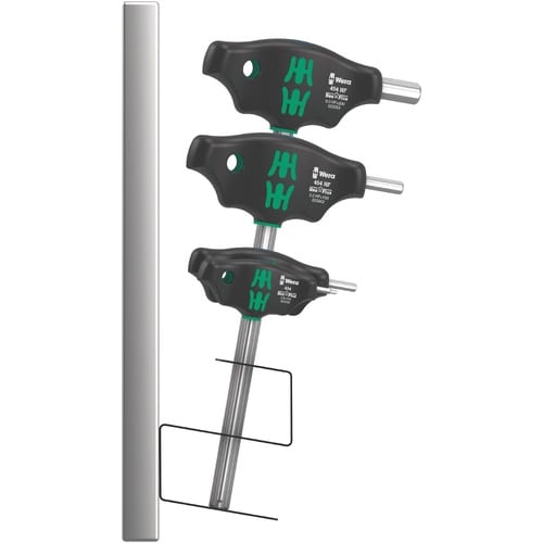 Tハンドル六角ドライバー023332(2.5mm)、Tハンドル六角ドライバー保持機能付023334・023338・023343・023347・023353・023355(3・4・5・6・8・10mm)、Tハンドルドライバー用メタルラック136424(214×78mm)